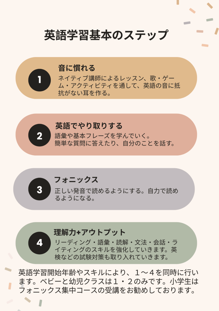 ベビークラスでは、音に慣れることが主な目標となり、少しずつ語彙や簡単なフレーズも練習していきます(ステップ1・2)。幼稚園年長以降には、正しい発音で読めるようにするフォニックスを少しずつ学習していき、小学高学年までに読解力や会話力を着実に身に着けられるようにステップアップしていきます(ステップ3・4)。